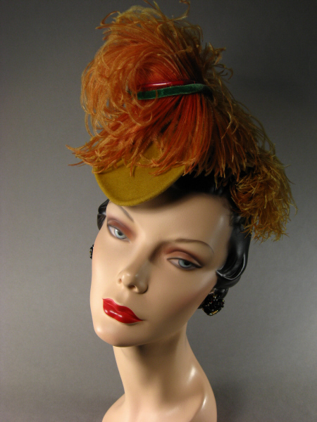 This show-stopping, mustard colored felt hat with fabulous ostrich feathers dates from the late thirties, early forties. Maker unknown. From my private collection. Click photo to enlarge